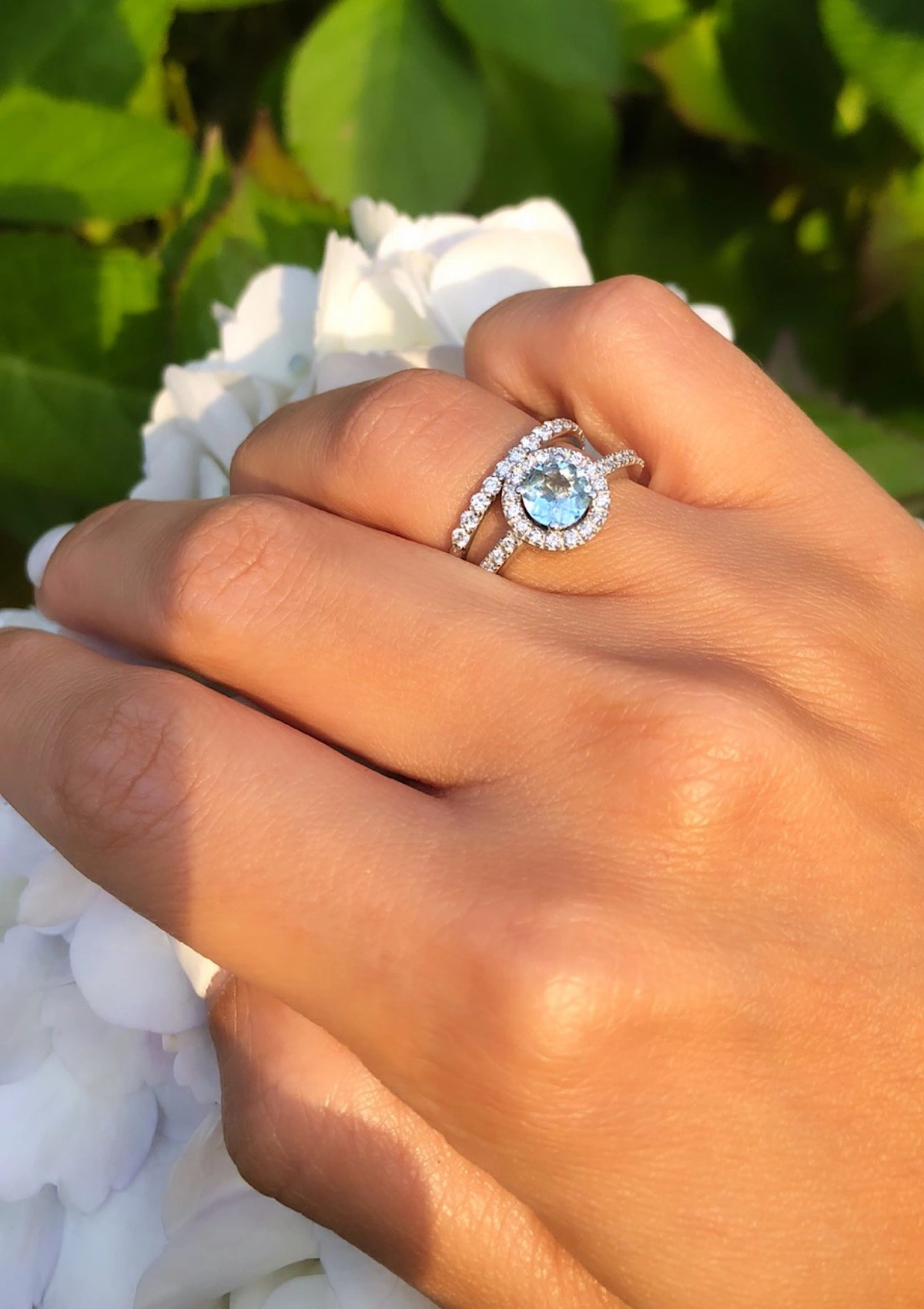 The AMALFI ring in 18K white gold is a meticulous and stylish design with a striking visual impact. It is crowned with a beautiful, luminous aquamarine that captures the calm and energy of the ocean. Surrounding it, a halo of diamonds enhances every detail, adding timelessness and distinction to any of your outfits.