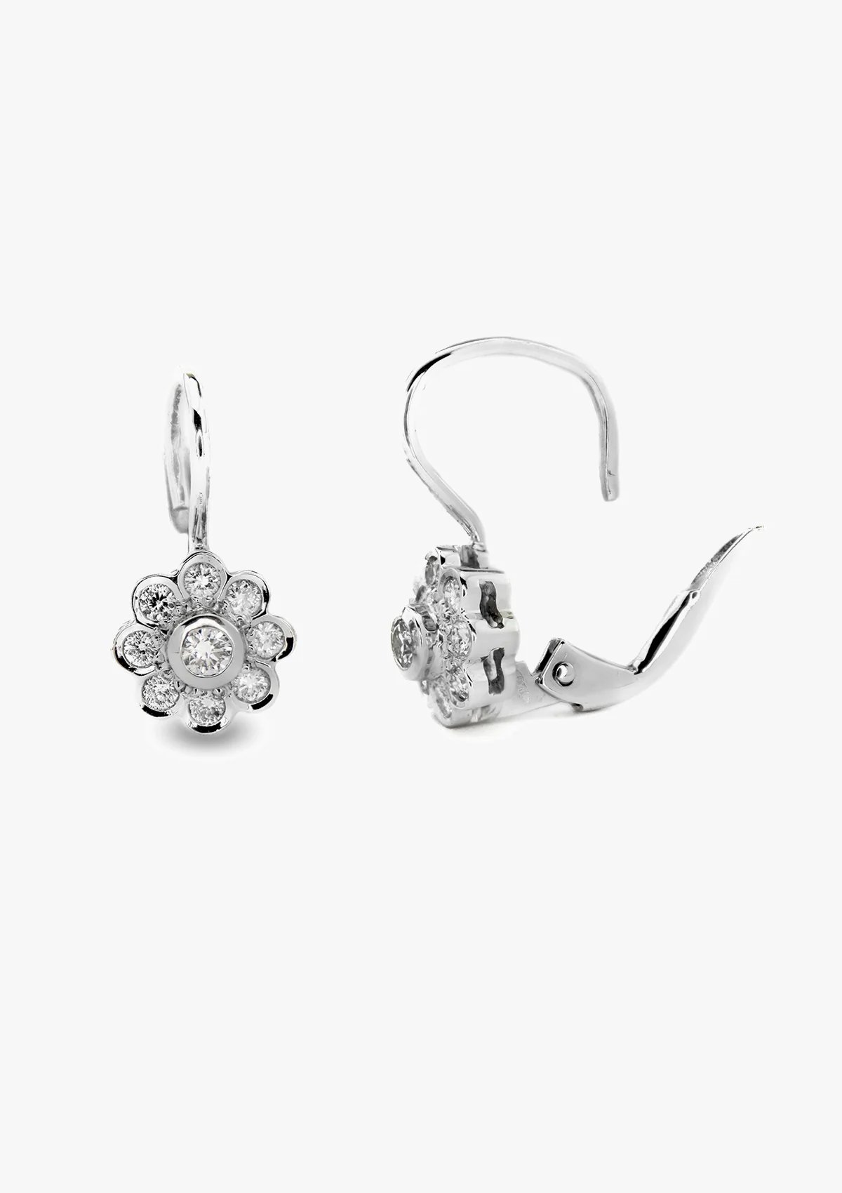 Lovely brilliant cut diamond rosette earrings handcrafted in 18K white gold endowed with leverback closures.
