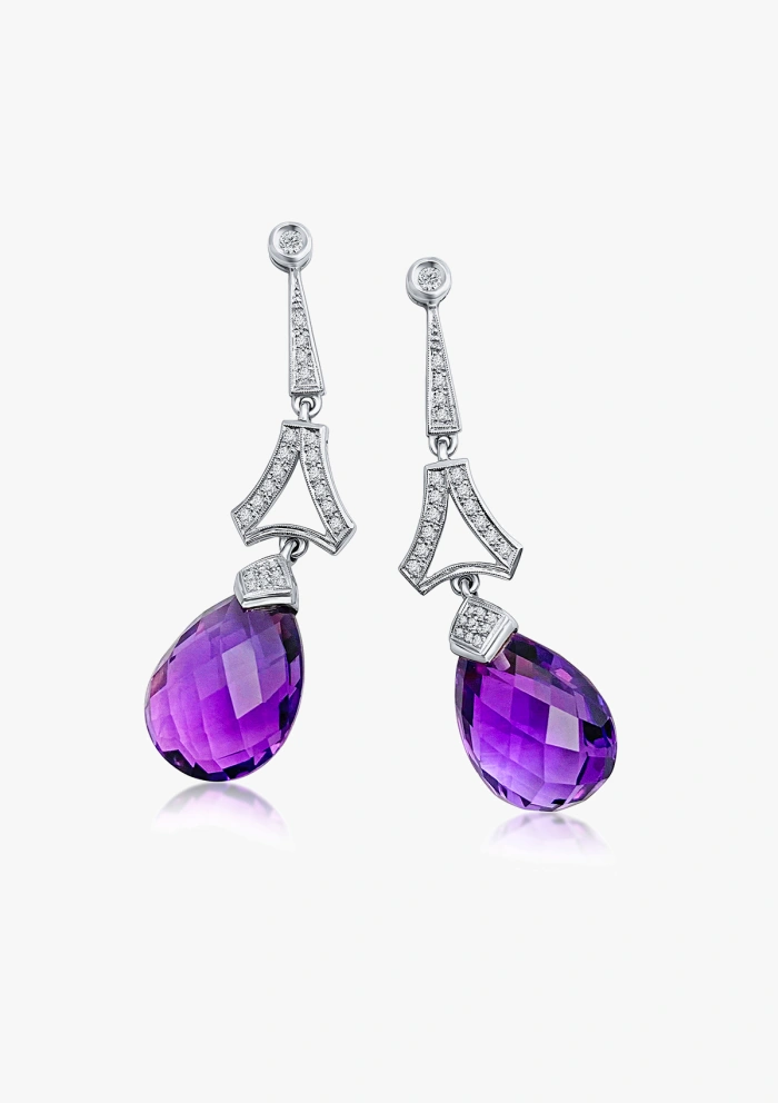 Delivery between 2-3 working daysLovely extra long earrings handcrafted in 18K white gold with diamonds and a pair of amathysts briolette almond drops.