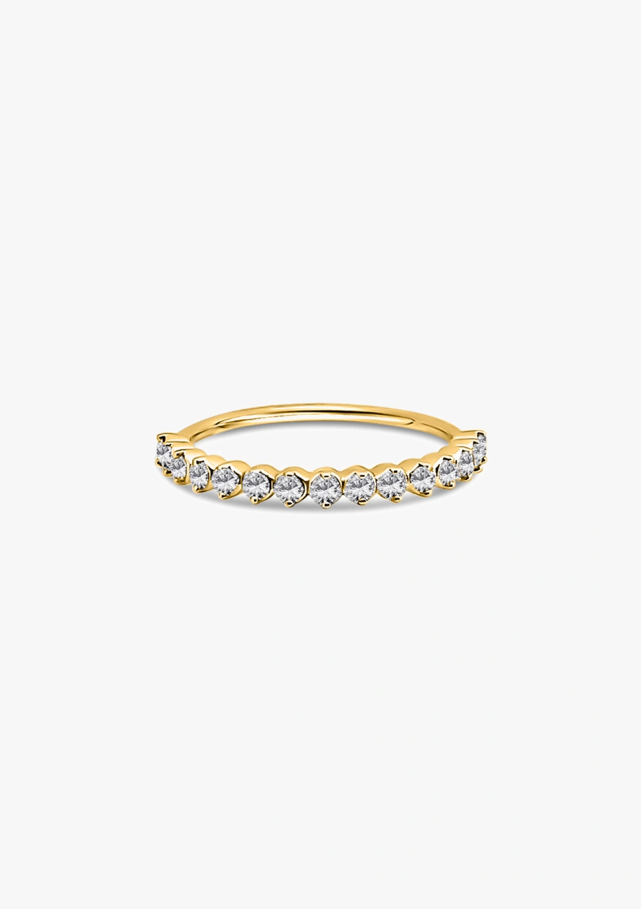 Delicate design and pure elegance in every millimeter. The STELLA half eternity ring carefully handcrafted in 18K gold is a Jewel that attracts you from the first moment. A lovely piece that you always want to wear and combine it with any of your looks. A lifelong Jewel that trascends trends.