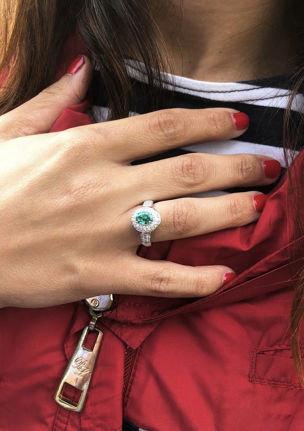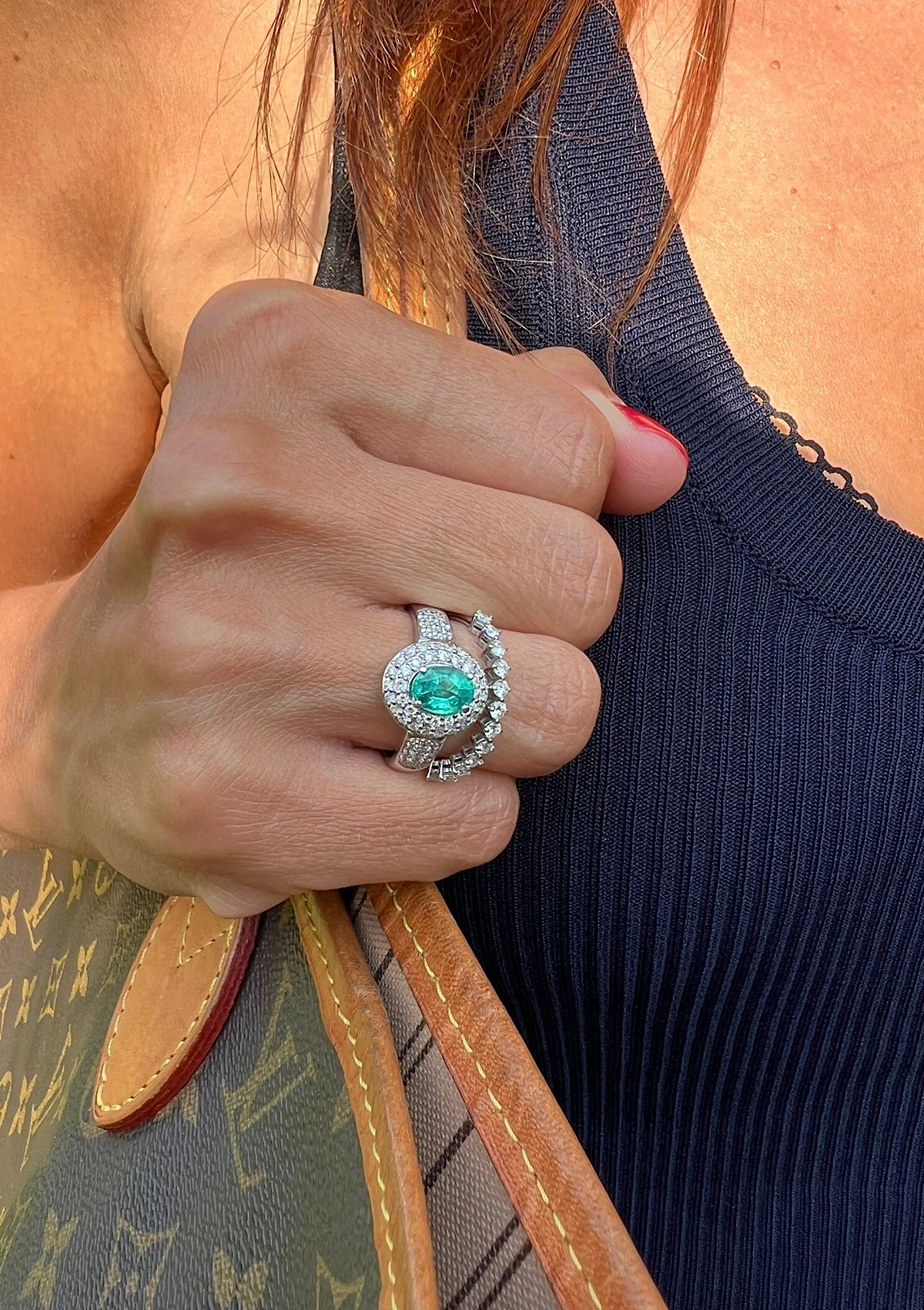Design, elegance and sophistication come together in the LEILONIE ring. A spectacular setting of pave diamonds surrounds a fascinating oval cut colombian emerald, enhancing its presence and giving it greater prominence. A piece of Fine Jewelry that we have specially conceived as an Engagement Ring, but due to its great versatility and timelessness you can also enjoy and wear it in your day to day, at any time and in any place.