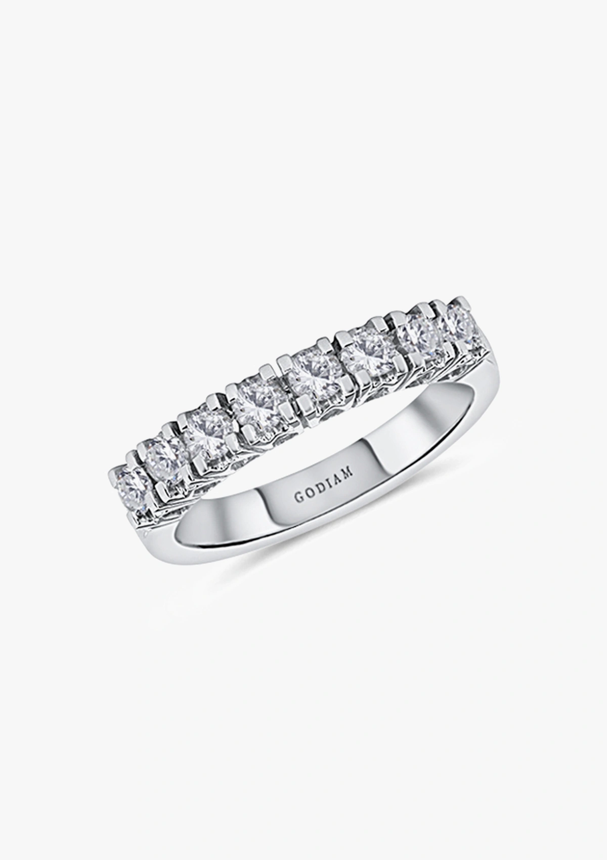 Delivery within 25 working daysLovely half eternity ring carefully handcrafted in 18K white gold with 8 brilliant cut diamonds shared prong setting.