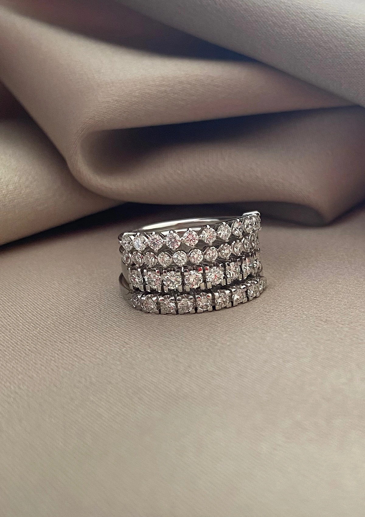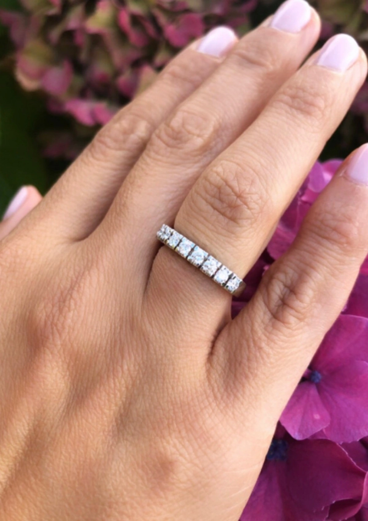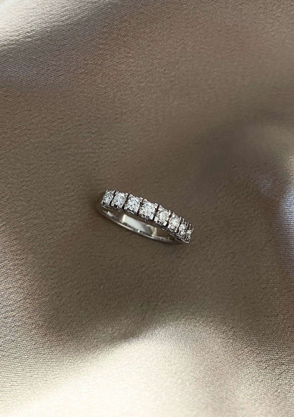 The ESTORIL diamond half eternity ring is an elegant and delicate design with a classic touch and a contemporary soul. A beloved Jewel that holds the promise of eternity. Its brilliant cut diamonds delicately set in high prongs give it presence and an avant-garde, sophisticated atmosphere.