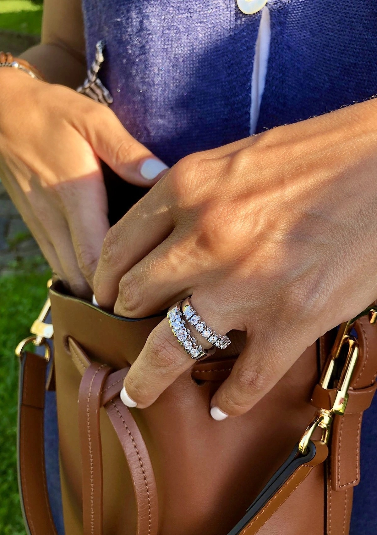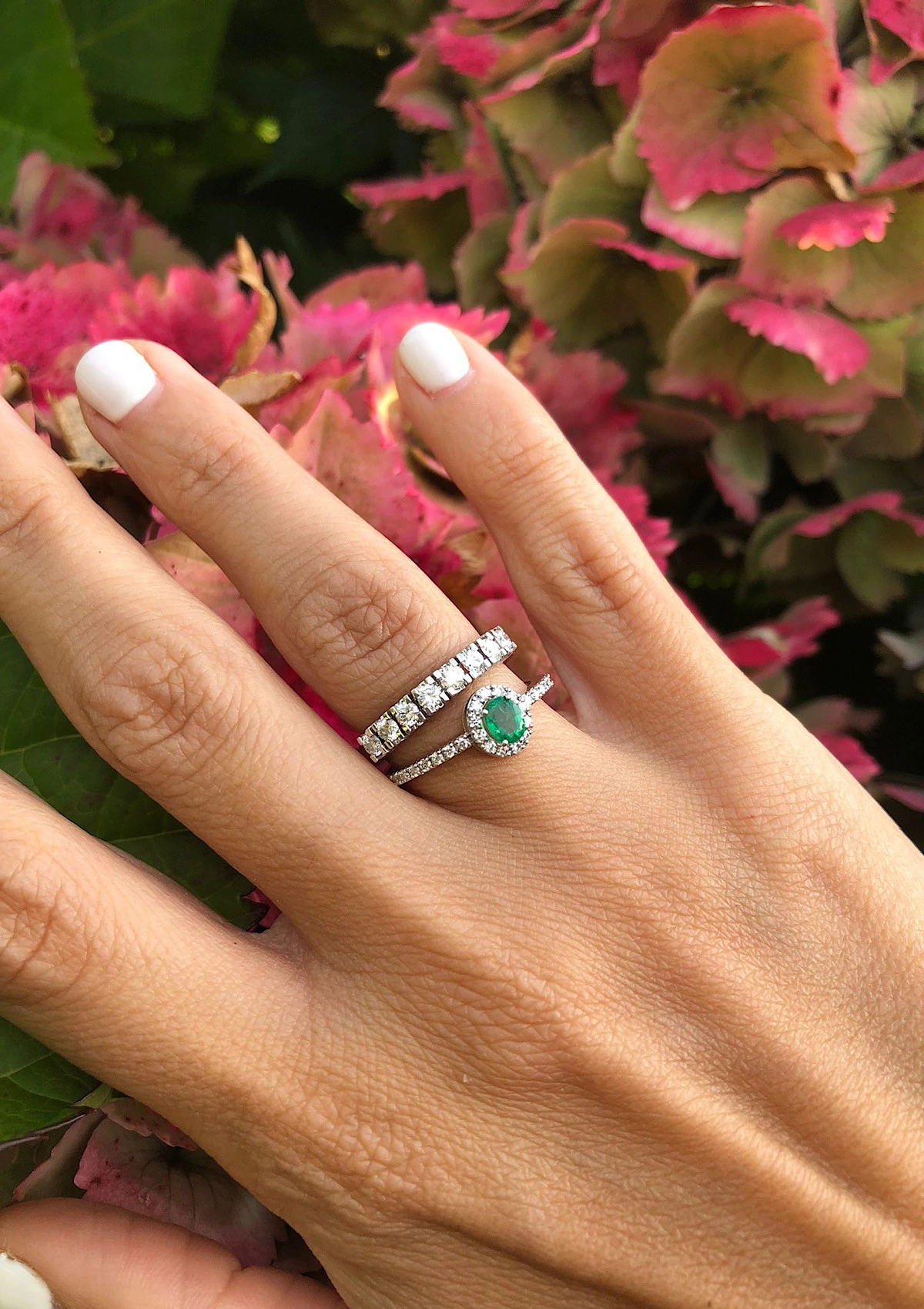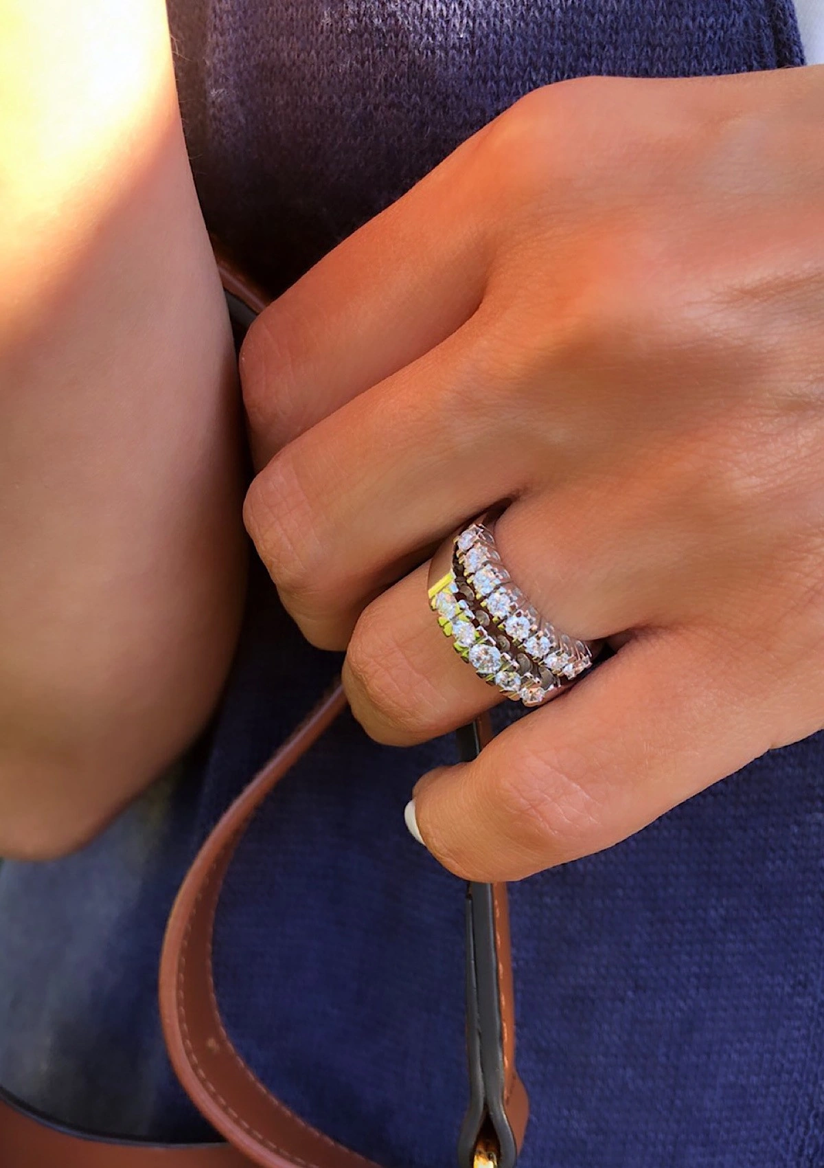 The ESTORIL diamond half eternity ring is an elegant and delicate design with a classic touch and a contemporary soul. A beloved Jewel that holds the promise of eternity. Its brilliant cut diamonds delicately set in high prongs give it presence and an avant-garde, sophisticated atmosphere.