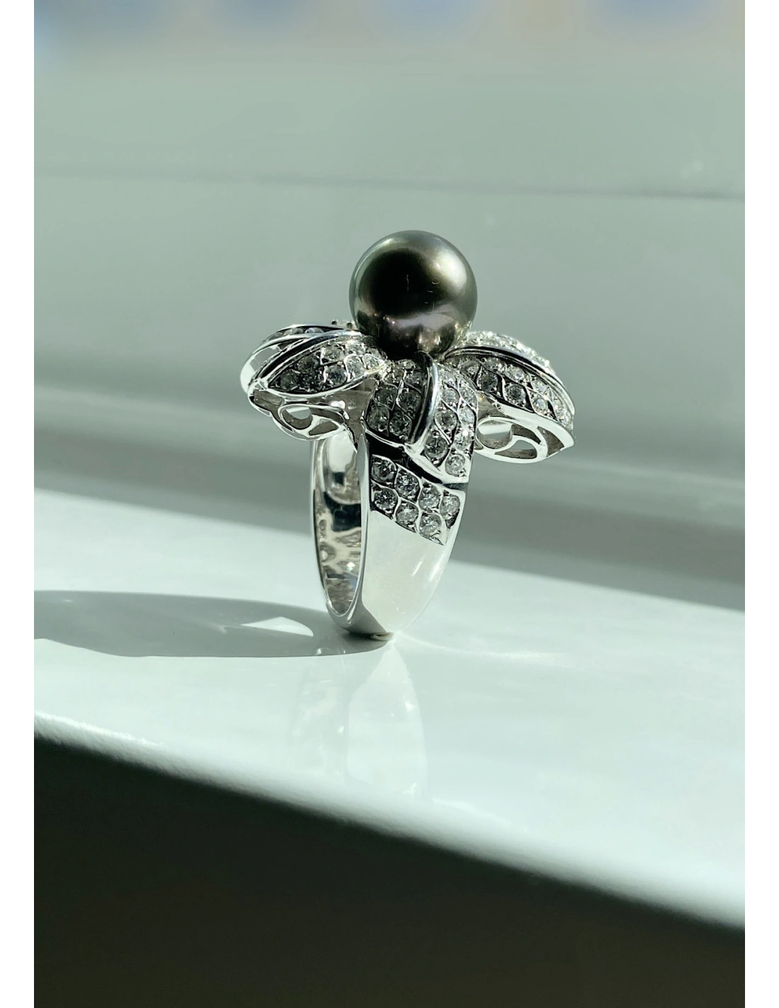 Delivery between 3-4 working daysStunning maxi ring handcrafted in 18K white gold with brilliant cut diamonds pave setting topped by an amazing 11mm round shape Tahitian Pearl.