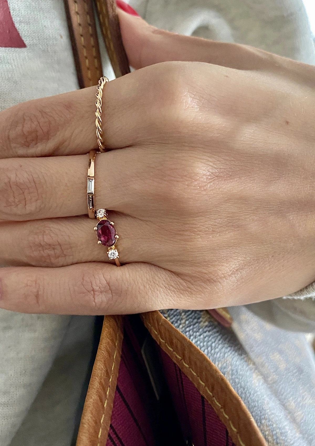 Un anillo muy versátil que podrás ponerte tanto como alianza como solitario. Su diamante talla baguette central le otorga a la alianza-solitario EVA fabricada artesanalmente en oro rosa de 18K un diseño muy estilizado, fresco, actual, que te apetece lucir siempre y combinarlo de mil maneras con otros anillos diferentes.