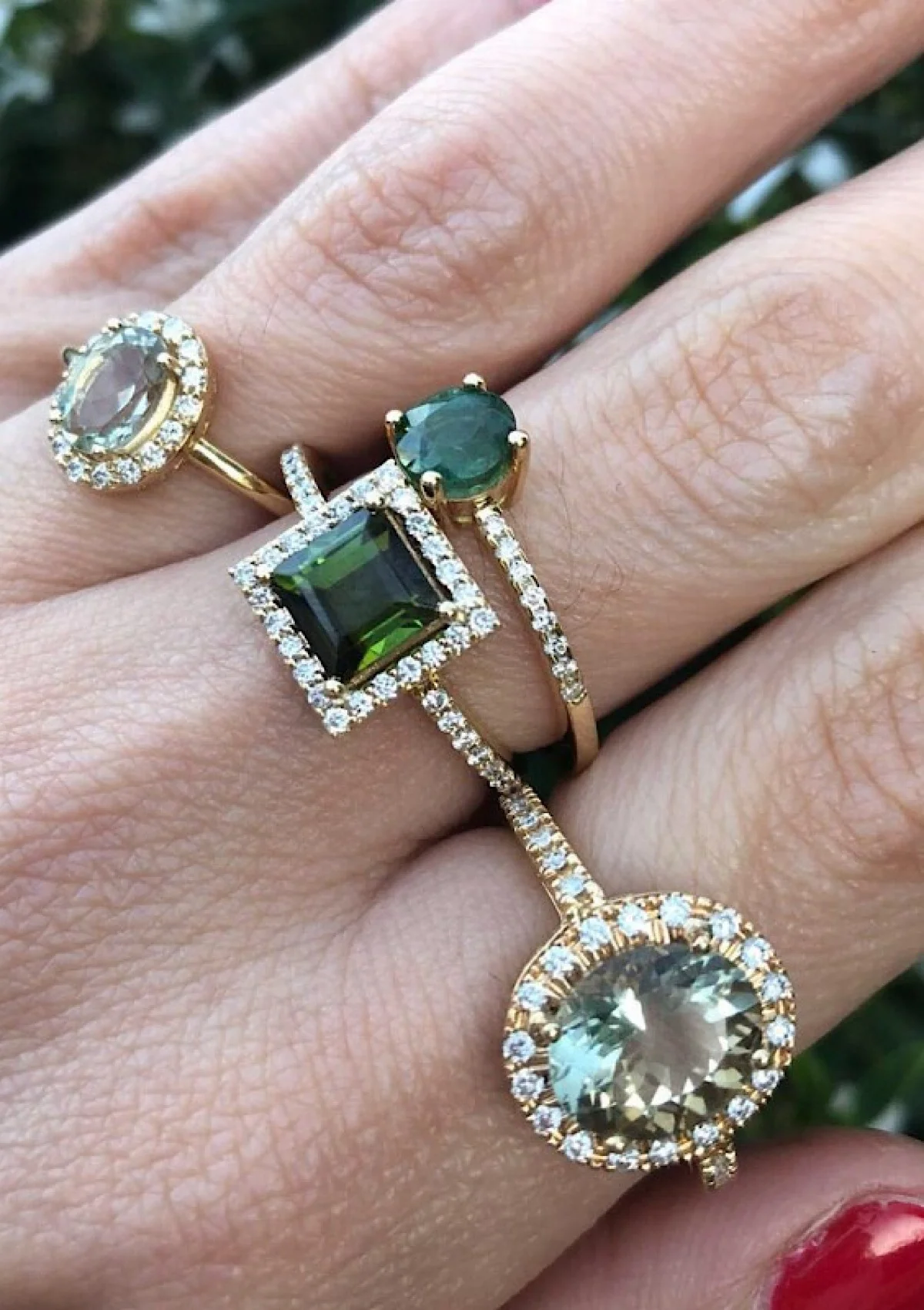 Anillo LUCÍA en oro amarillo de 18K con halo de diamantes y turmalina verde