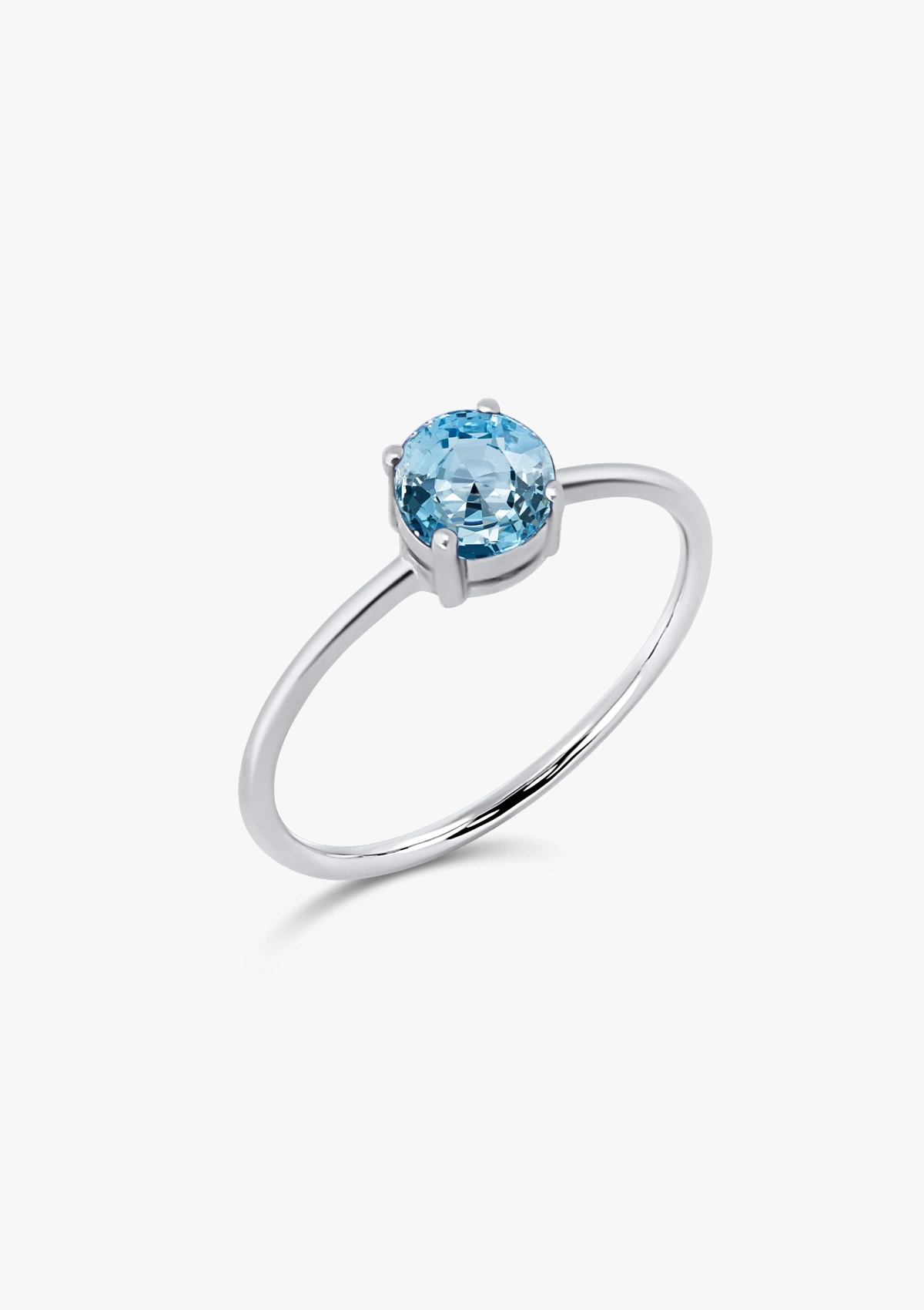 Simple et raffiné, élégant et délicat, facile à porter et polyvalent… voici le solitaire BEA orné d'une magnifique aigue-marine de 5 mm de diamètre serti sur quatre griffes, sur son anneau rond stylisé en or 18K. Une pièce incontournable à ajouter absolument à vos essentiels.