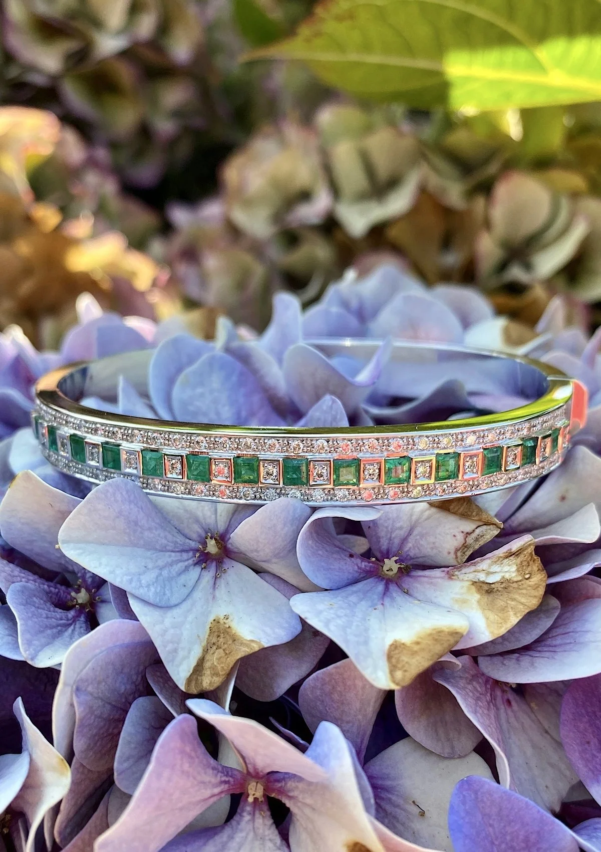 Bracelet rigide spectaculaire en or blanc 18 carats orné d'une combinaison raffinée de diamants taille brillant et d'émeraudes colombiennes taille princesse.