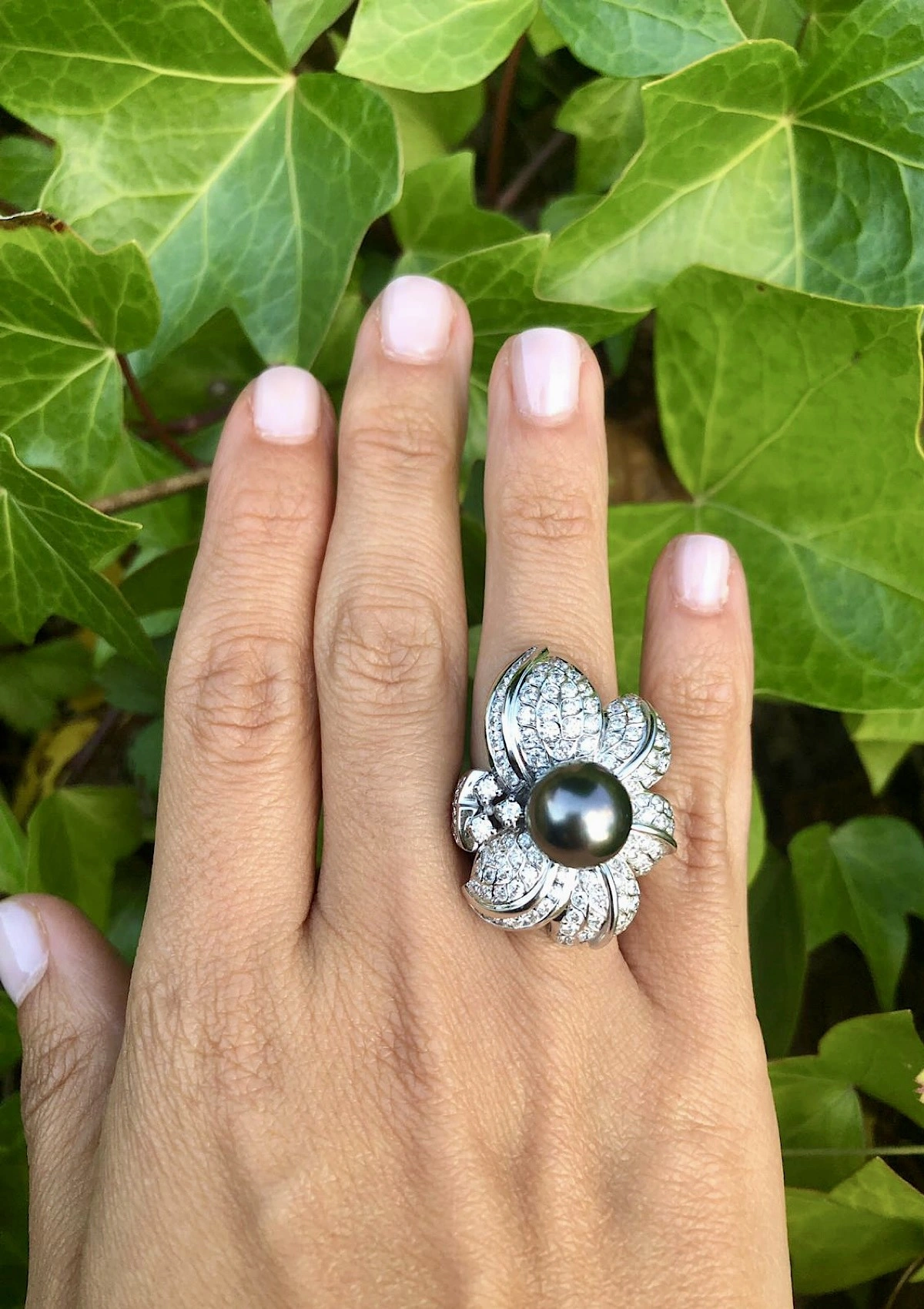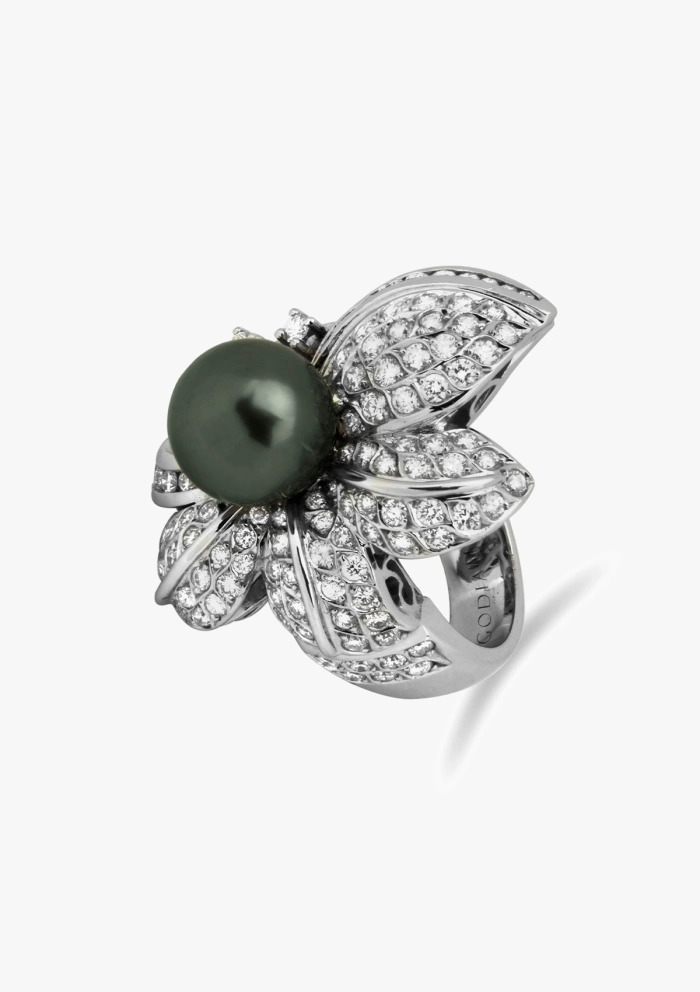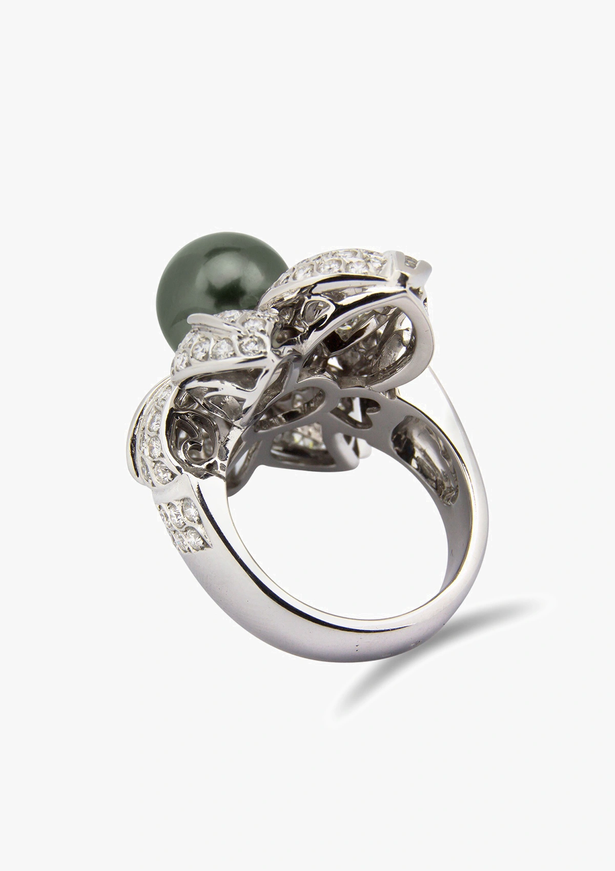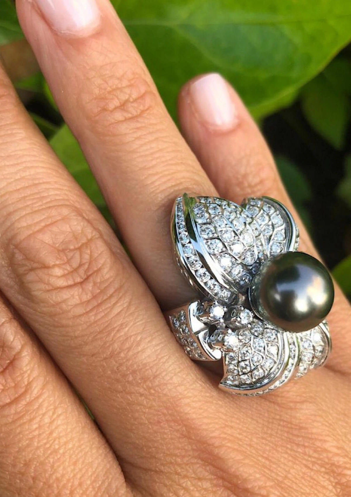 Spectaculaire bague maxi en or blanc 18 carats avec pavé de diamants taille brillant et couronnée d'une perle de Tahiti exceptionnelle de 11mm de diamètre.