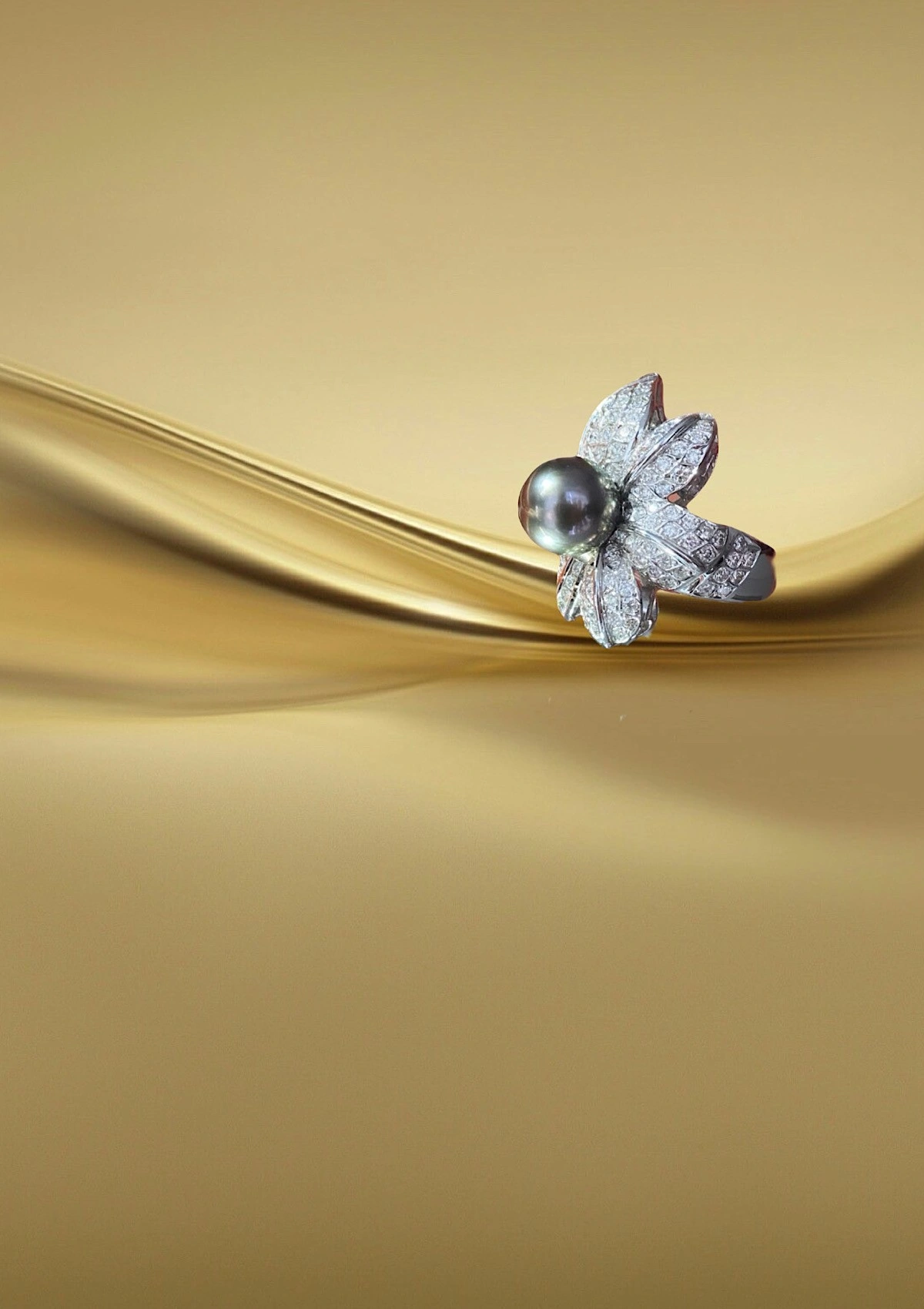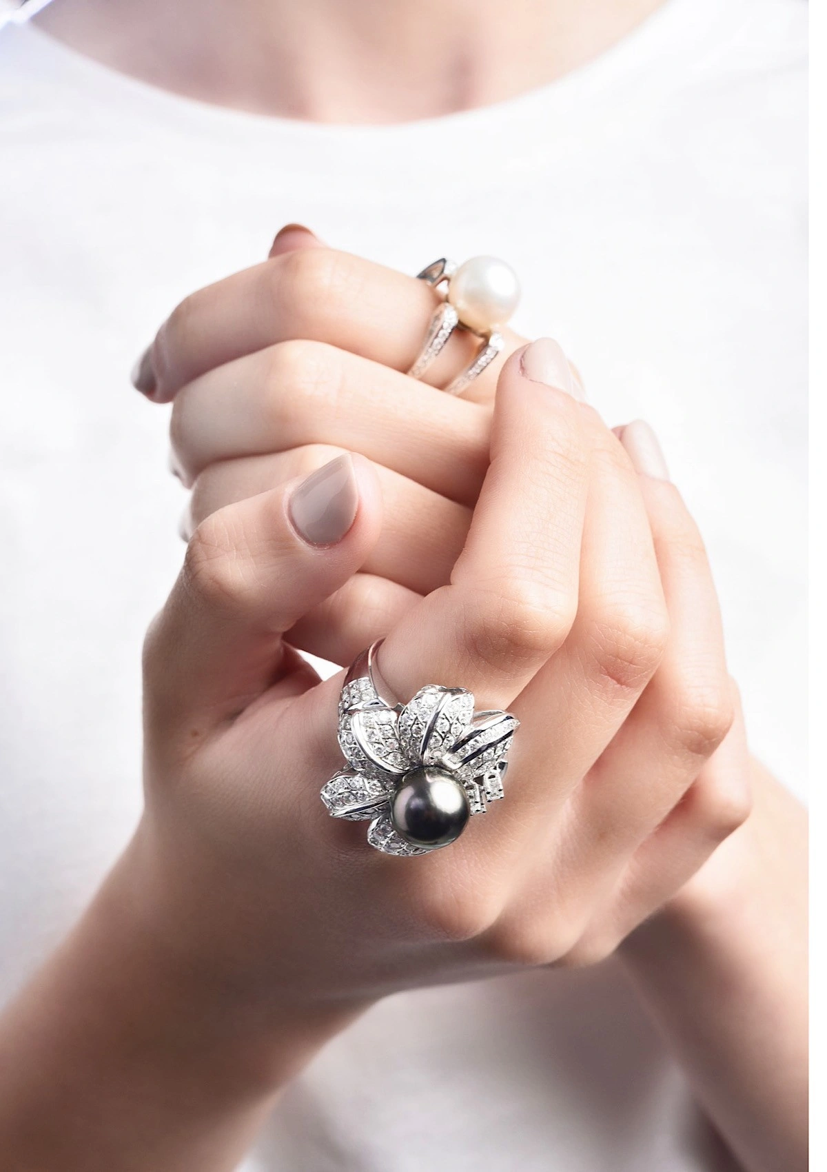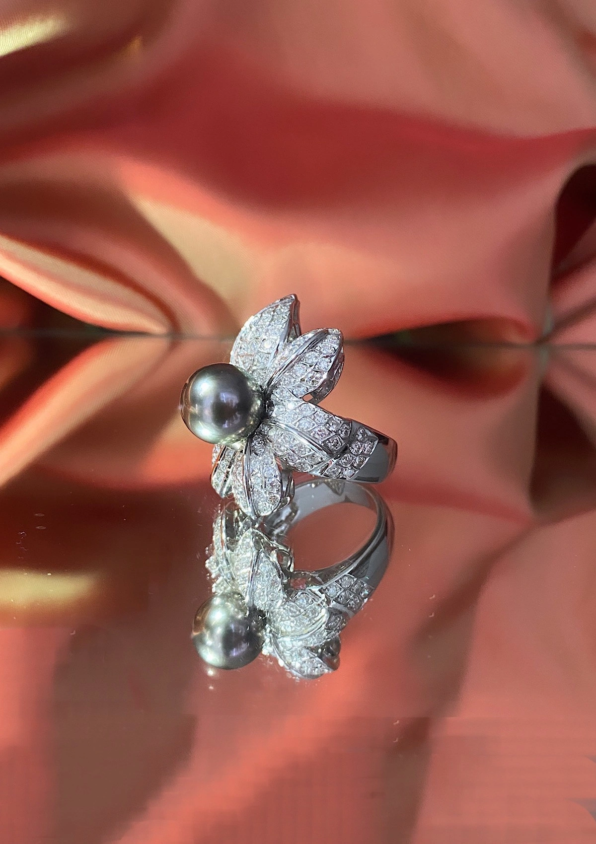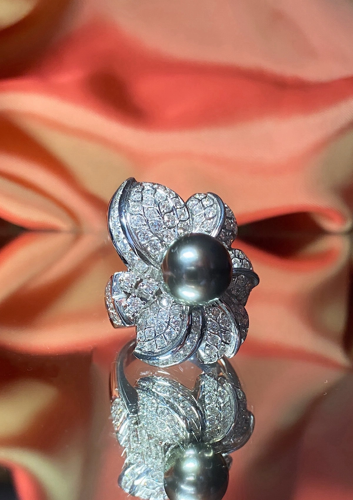 Spectaculaire bague maxi en or blanc 18 carats avec pavé de diamants taille brillant et couronnée d'une perle de Tahiti exceptionnelle de 11mm de diamètre.