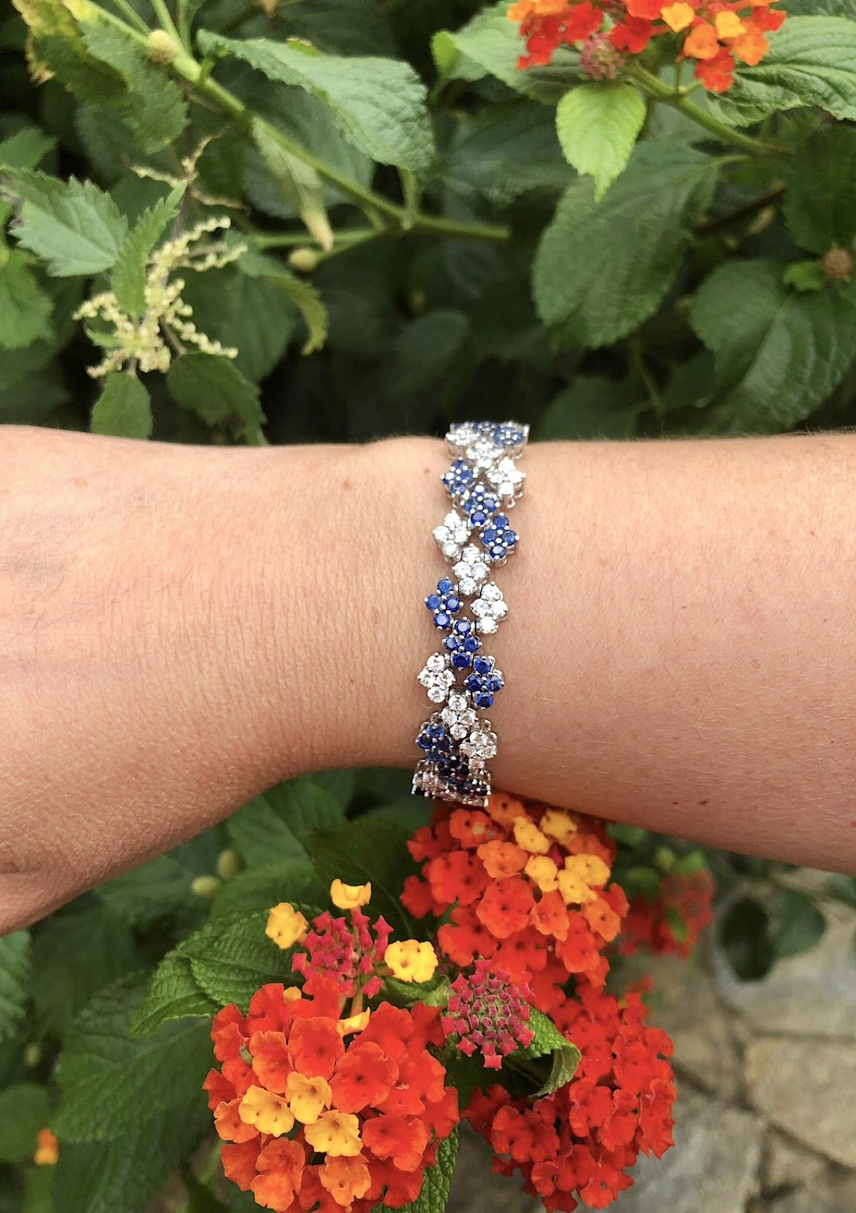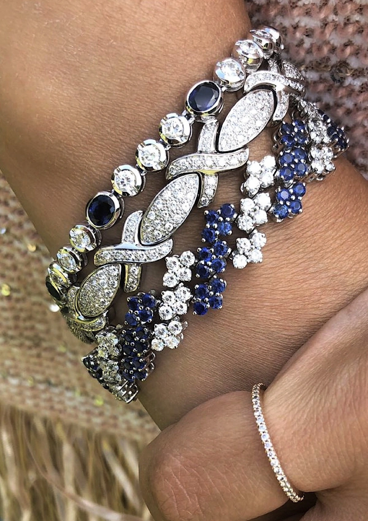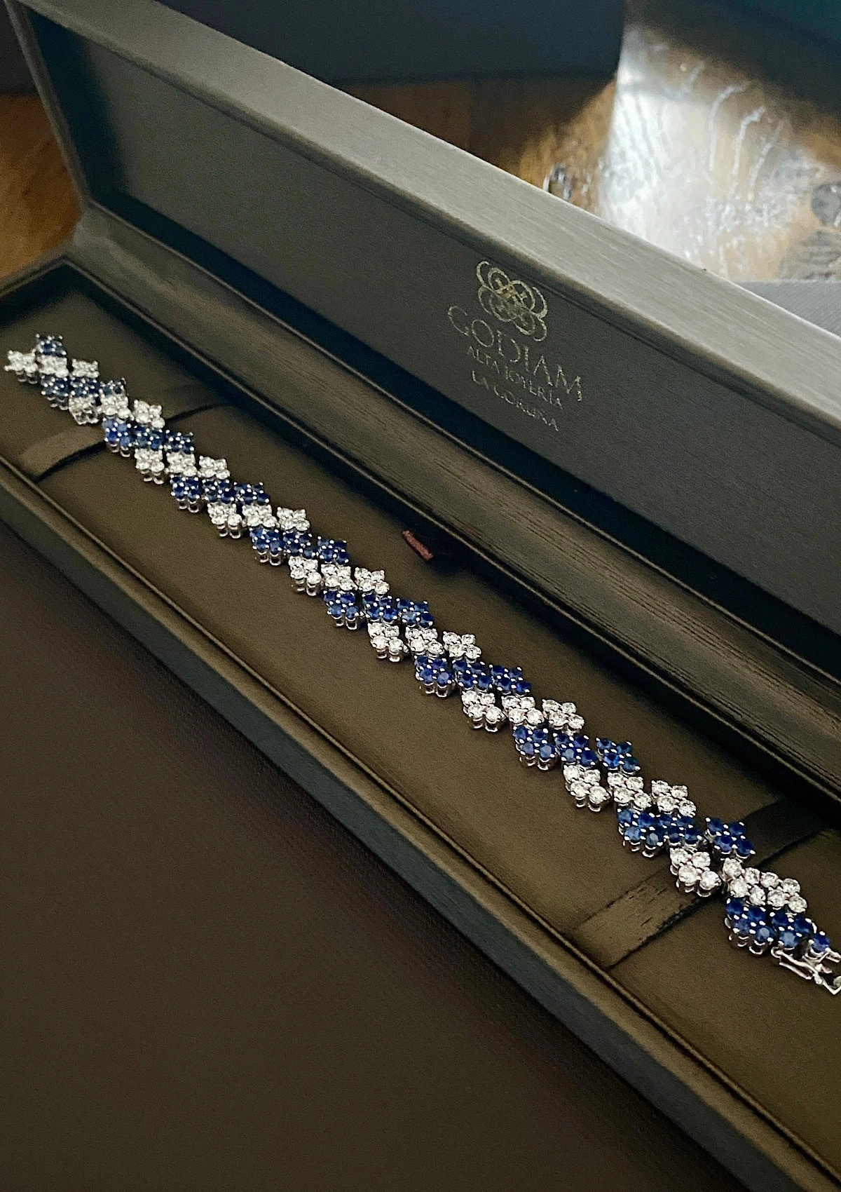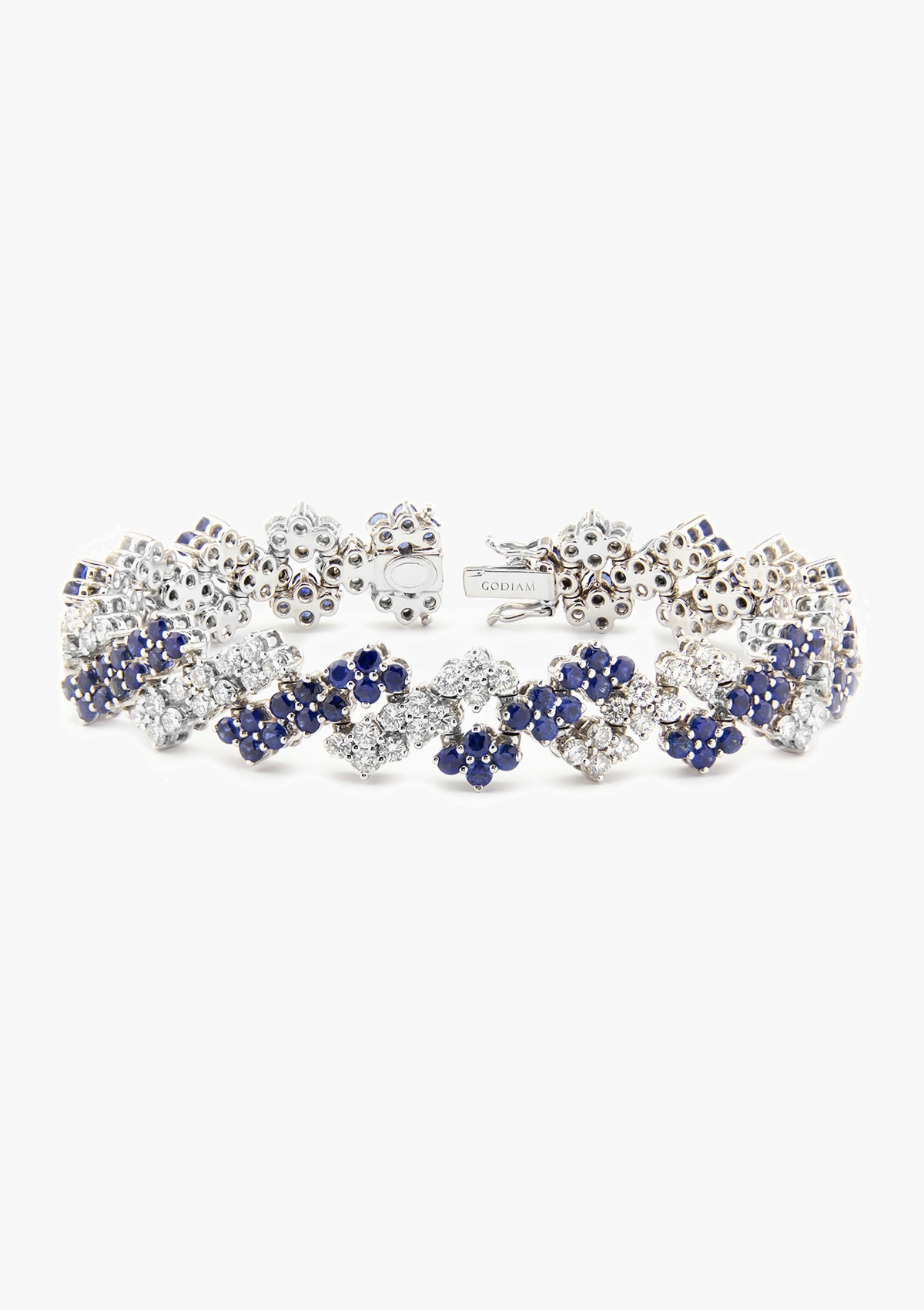Bracelet articulé spectaculaire en or blanc 18 carats avec une combinaison sélectionnée de diamants taille brillant et de saphirs bleus.