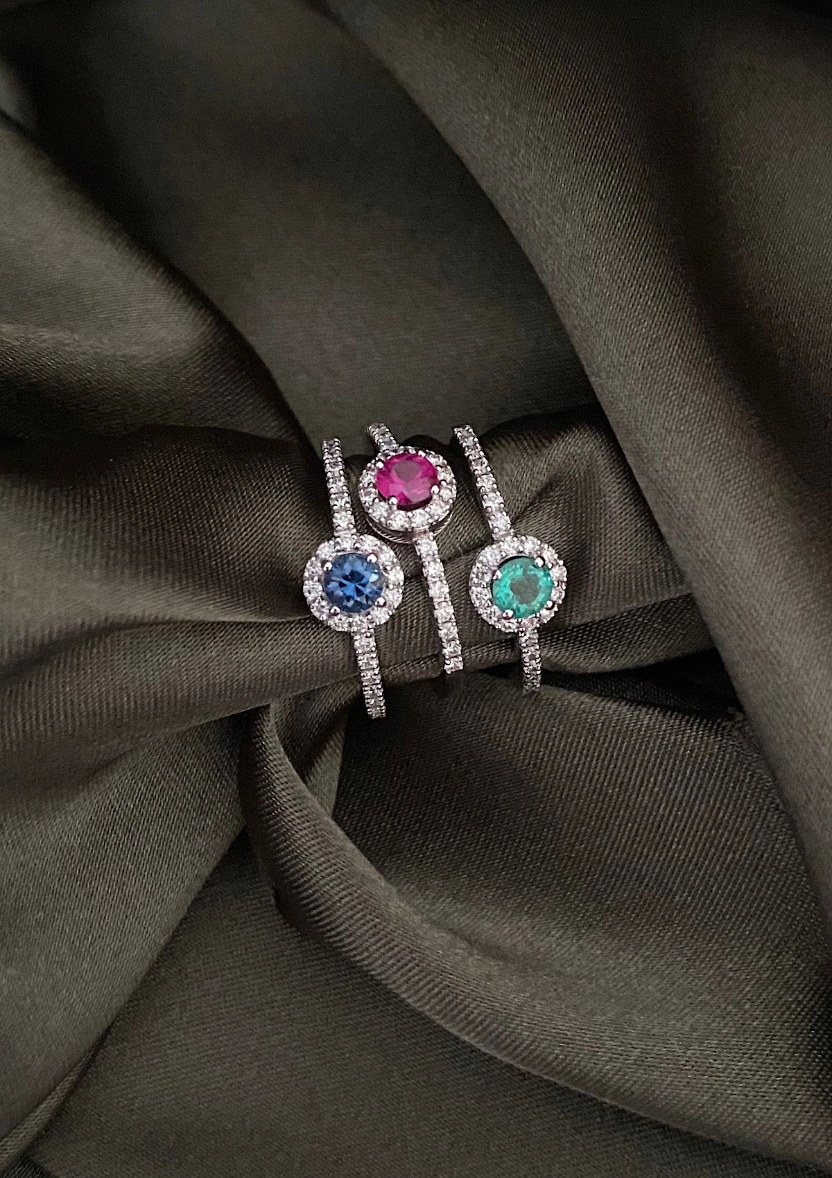 Anel ROUND GREEN em ouro 18K com halo de diamantes e esmeralda