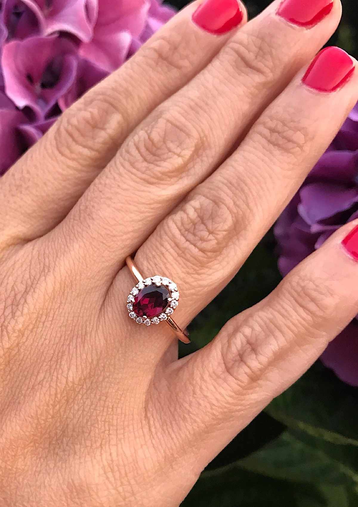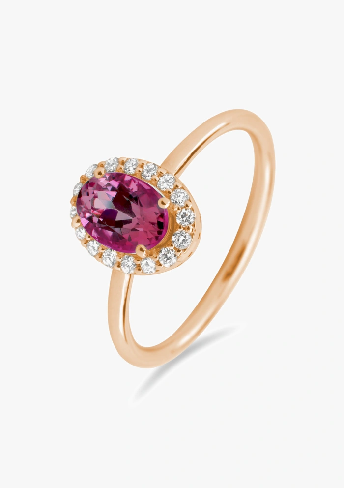 Elegante anel feito em ouro rosa de 18 quilates com um halo de diamantes lapidados brilhantes e coroado por uma rubelita lapidada em oval.