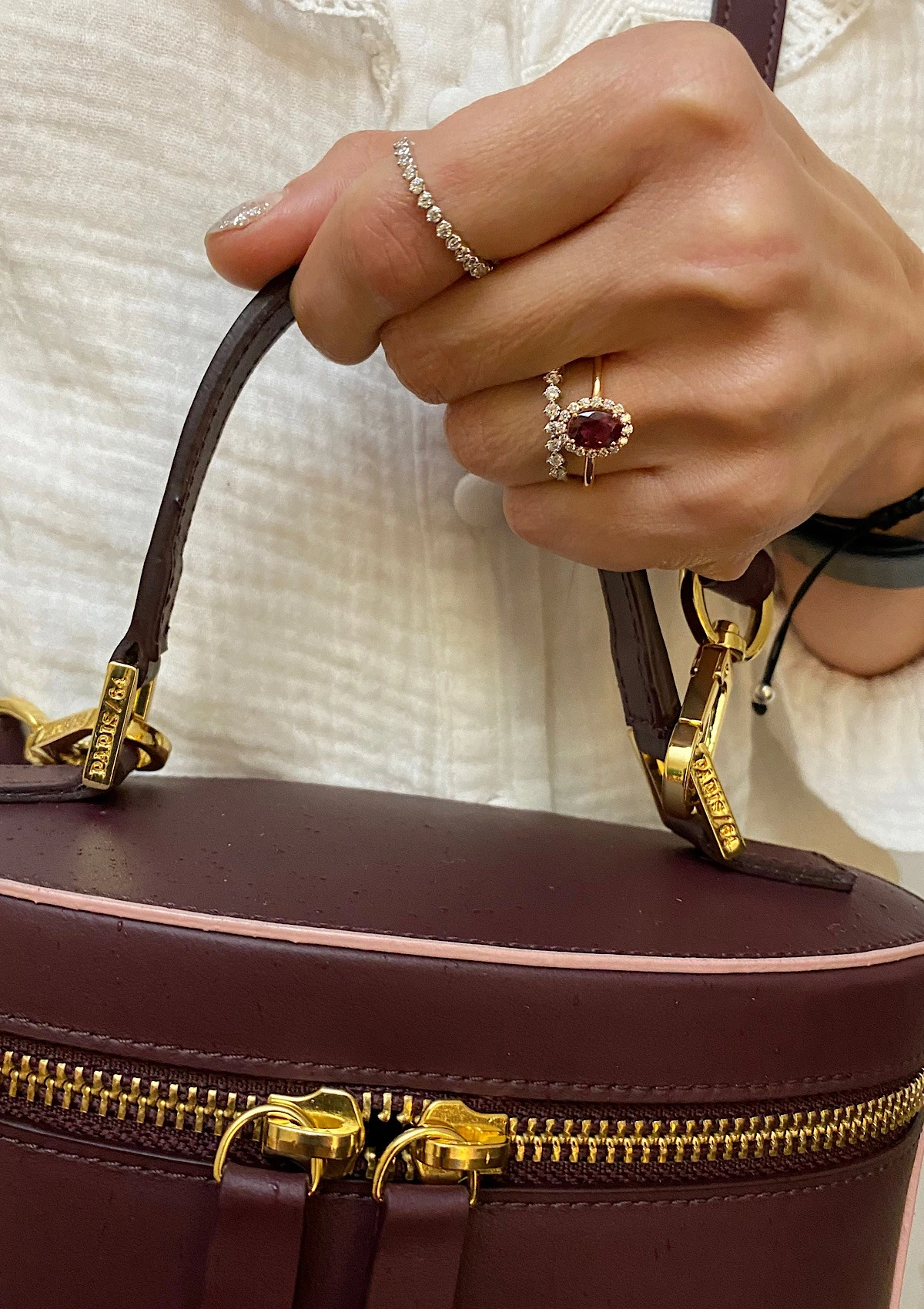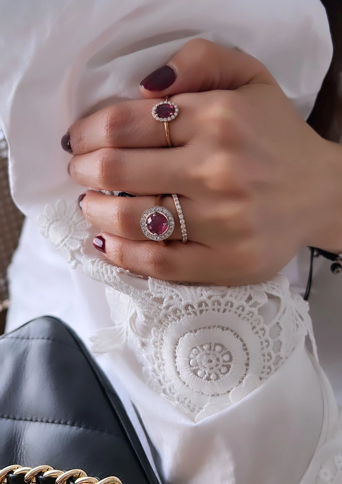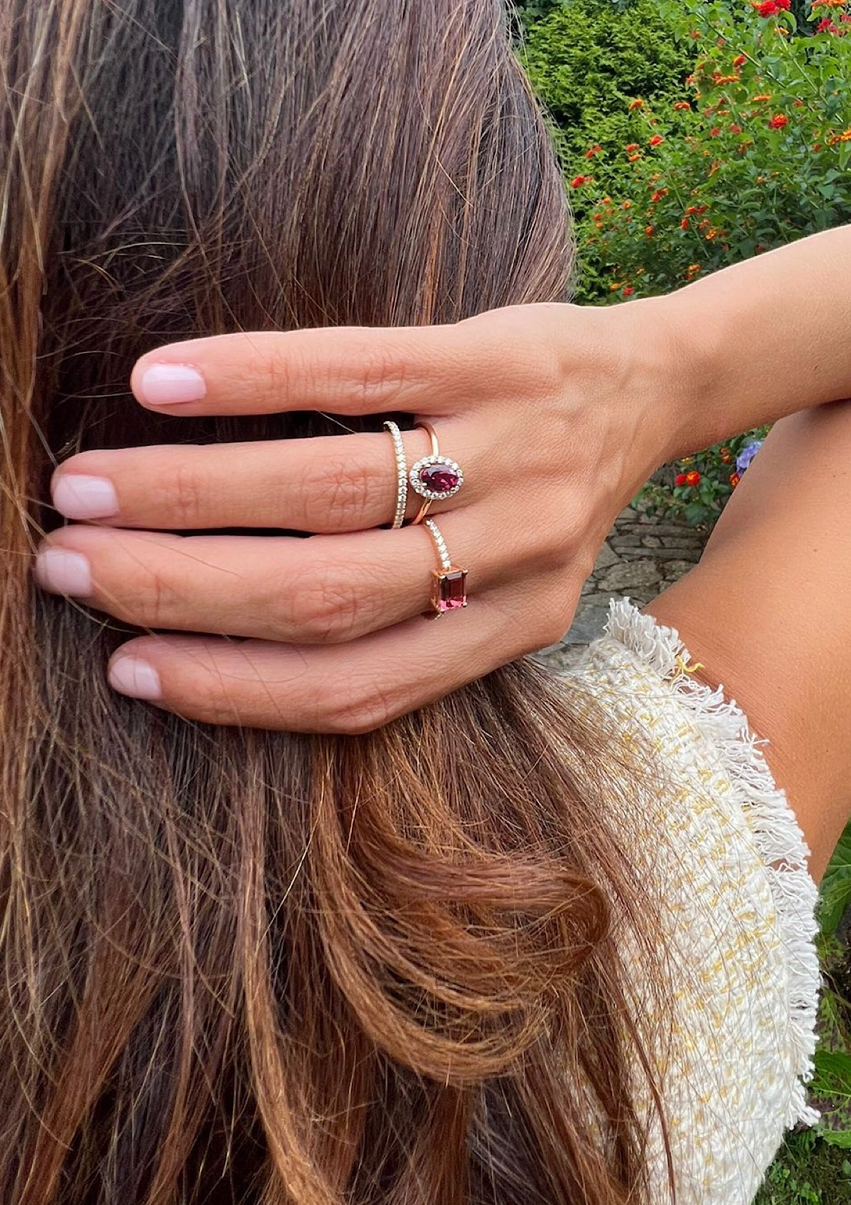 Anel INDIA em ouro rosa de 18K com halo de diamantes e rubelita