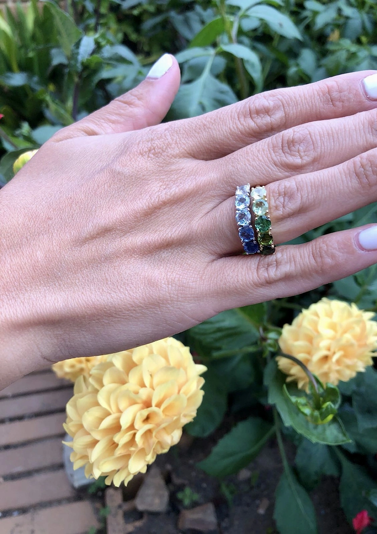 Linda meia aliança feita em ouro amarelo de 18 quilates numa combinação fascinante de tons de turmalinas verdes em degradê e crisoberilo.