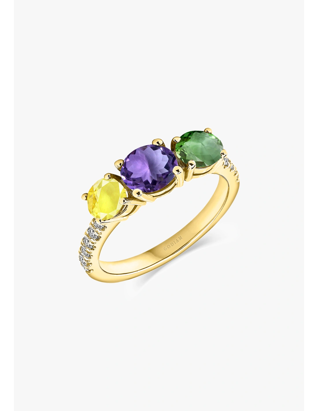 Anel trilogia TRIBECA em ouro amarelo de 18K com diamantes, iolita e turmalinas