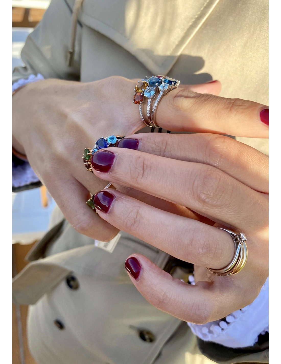 Um deslumbrante topázio London Blue no centro, ladeado por duas turmalinas laterais que realçam a sua profundidade, funde-se com diamantes de lapidação brilhante nas hastes, proporcionando luz e equilíbrio. Ideal para combinar de mil formas, para marcar um momento único ou simplesmente por fazer. Porque o essencial não precisa de desculpas.