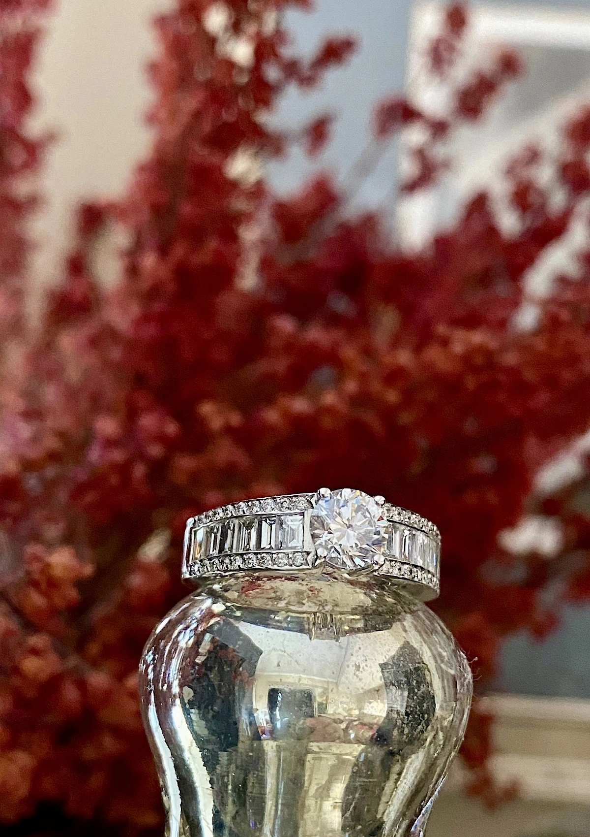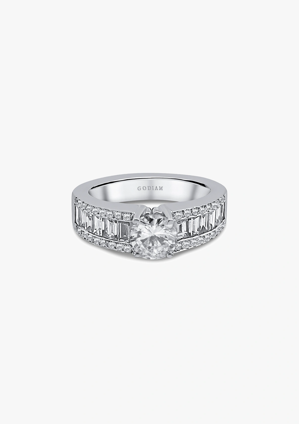 Anel sofisticado fabricado em ouro branco de 18 quilates com diamantes de lapidação brilhante e baguete.
