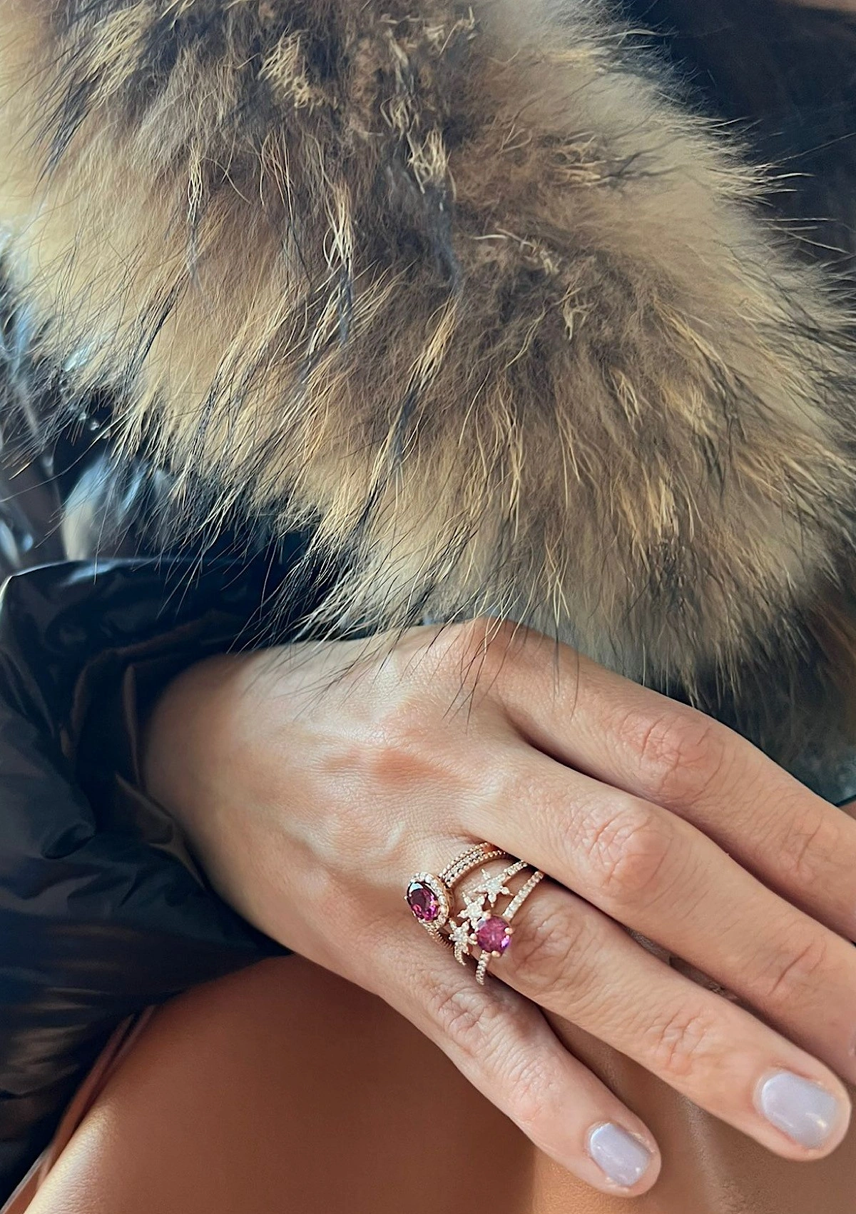 Anel PATRICIA em ouro rosa de 18K com halo de diamantes e turmalina rubelita