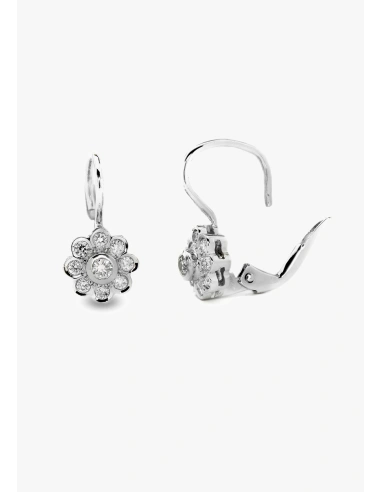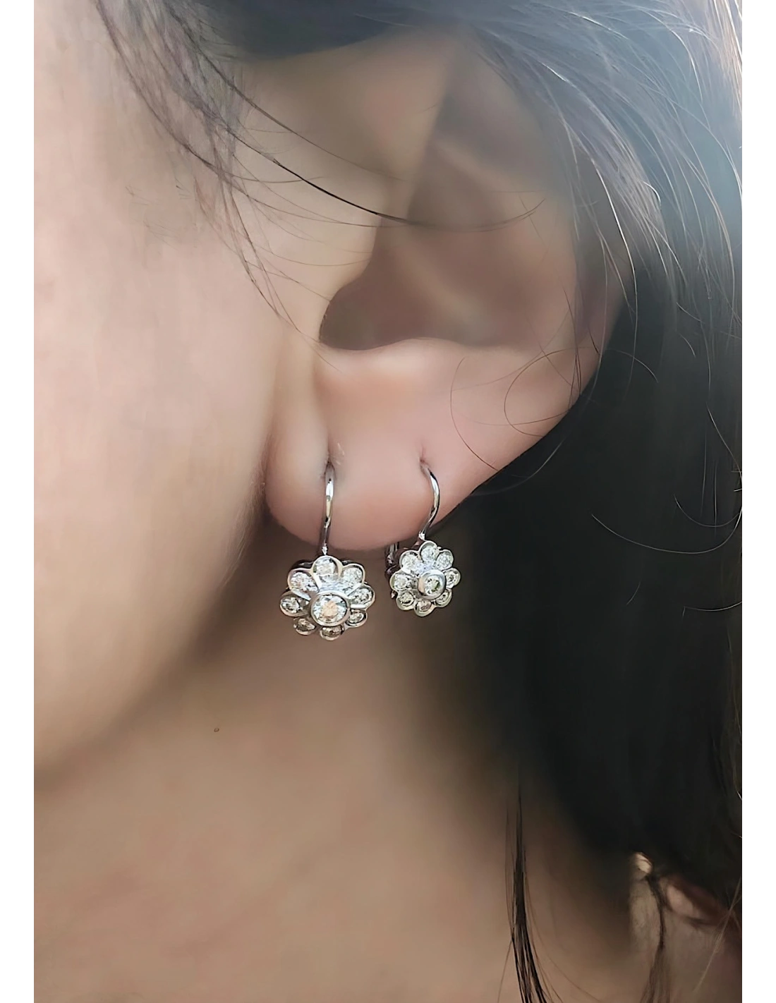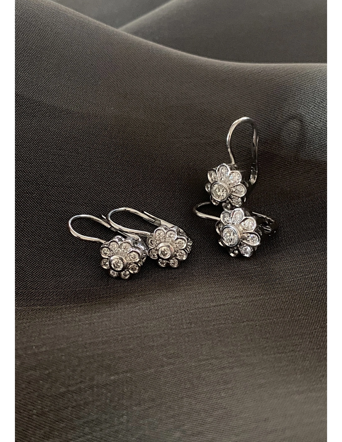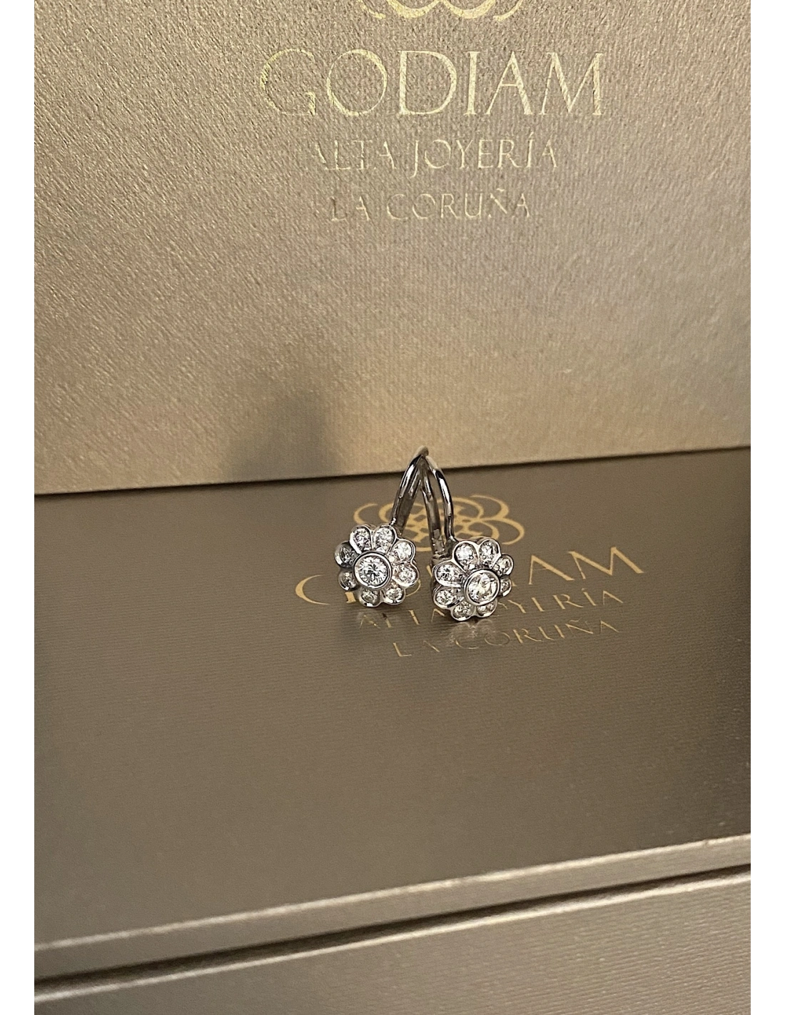 Brincos com fecho de alavanca fabricados em ouro branco de 18K com rosetas de diamantes de lapidação brilhante.