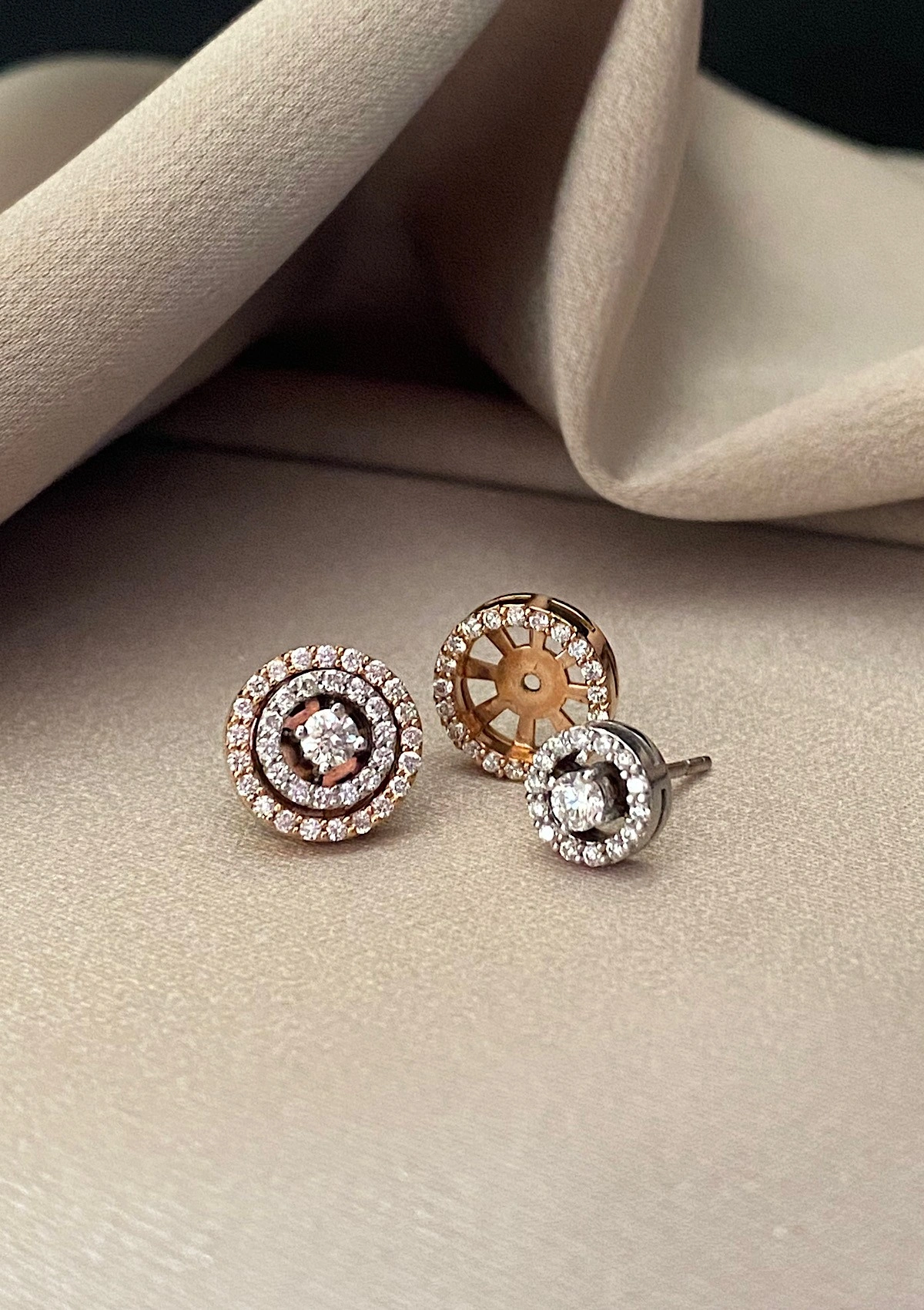 Brincos desmontáveis originais feitos de ouro branco e rosa de 18 quilates com um duplo halo de diamantes em lapidação brilhante.