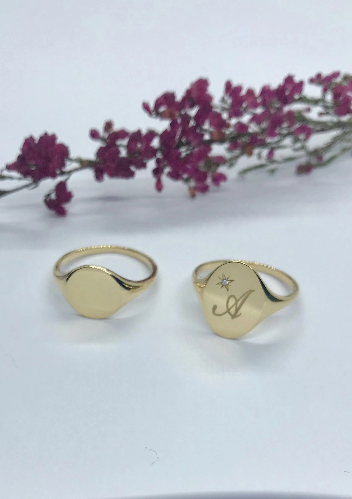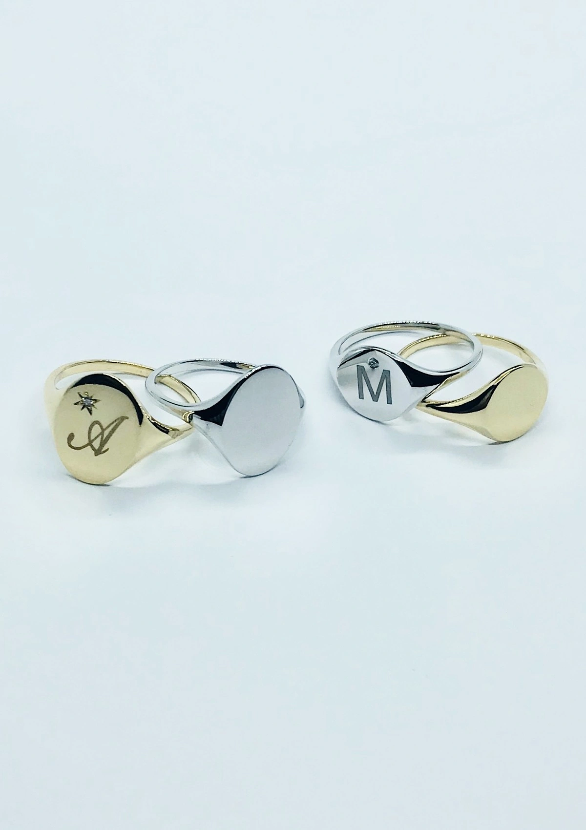 Simples, gravado com a sua inicial ou símbolo favorito, com um diamante de lapidação brilhante engastado no aro.