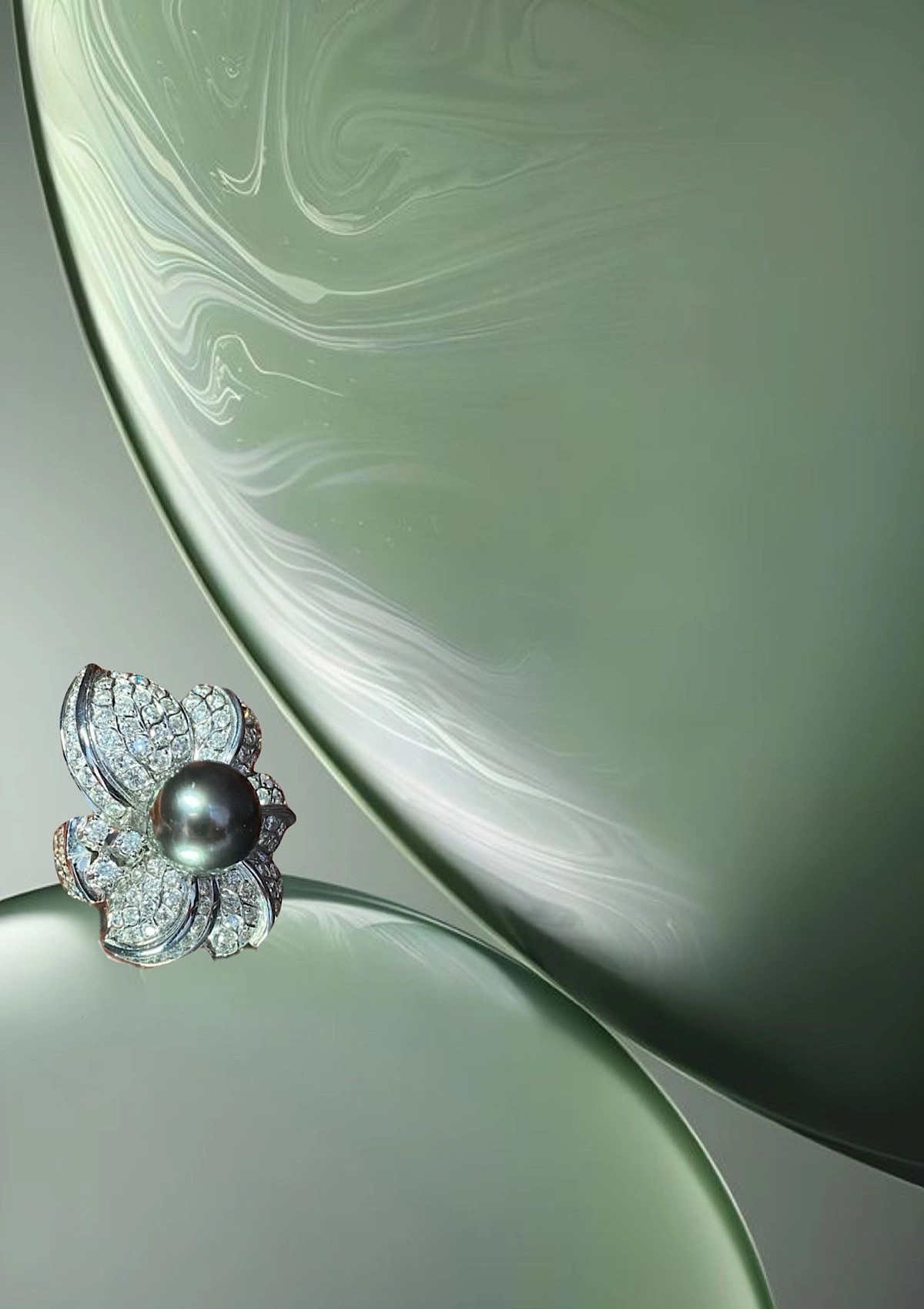 Anel maxi SOFÍA em ouro branco de 18K com diamantes e pérola do Taiti