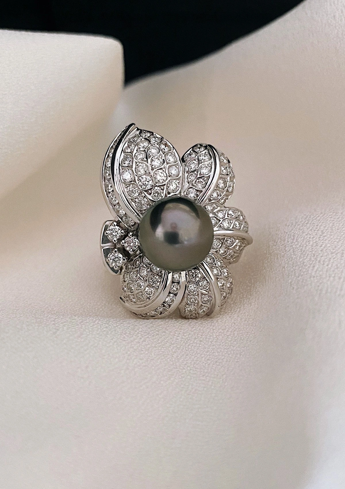 Espetacular anel maxi fabricado em ouro branco de 18 quilates com pavé de diamantes lapidados brilhantes e coroado por uma excecional pérola do Taiti de 11mm de diâmetro.